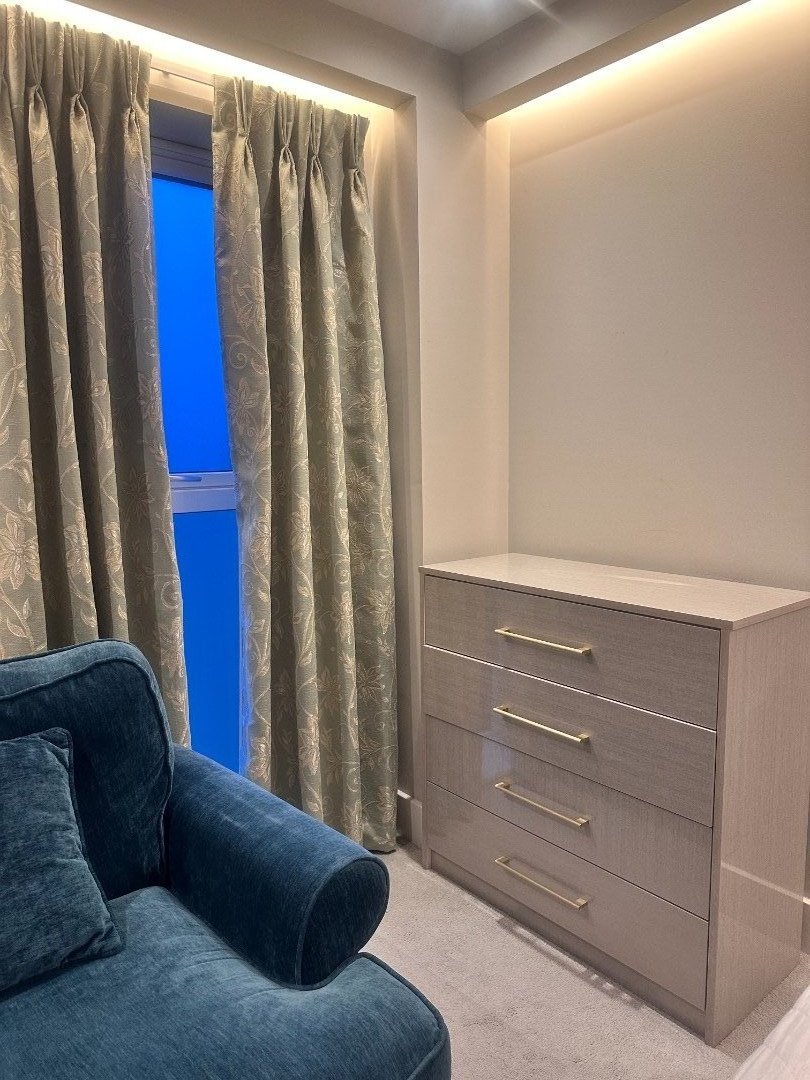 This spacious king‑size bedroom comes fully furnished with a double wardrobe, chest of drawers, and a comfortable sofa, giving you plenty of space to relax.